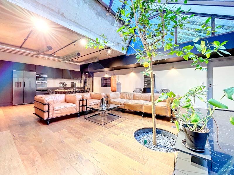 Dès l’entrée, vous serez captivé par le plafond cathédrale vitré culminant à 5,30 m, apportant une luminosité exceptionnelle à la volumineuse pièce de vie. Celle-ci comprend une cuisine ouverte entièrement équipée, une cave à vin intégrée, idéale pour les amateurs, ainsi qu’un séjour chaleureux agrémenté d’un poêle à bois et d’un véritable oranger. Les sols mêlent parquet massif et carrelage gris cérame de qualité.
